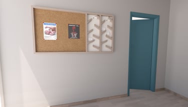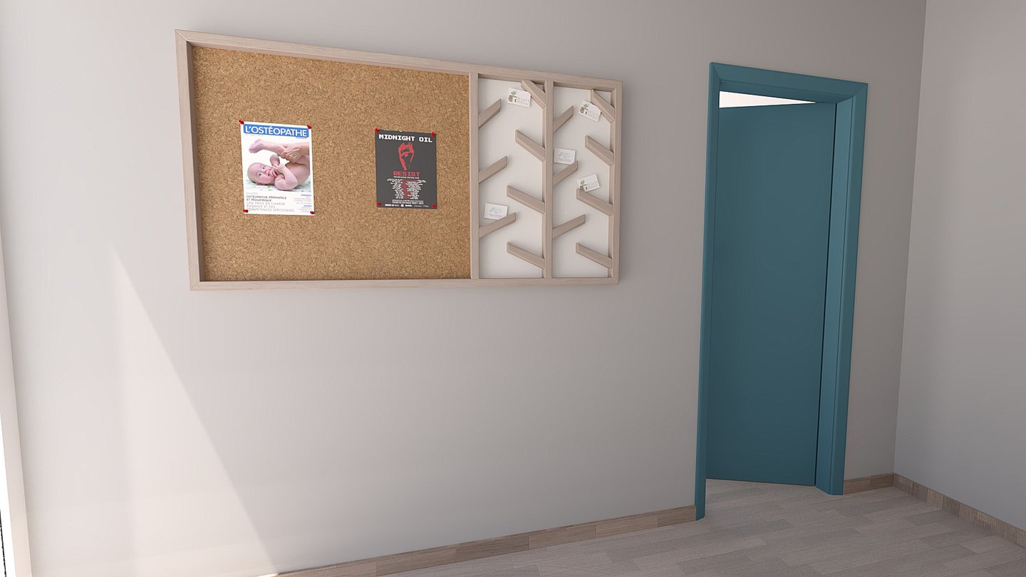 Rebecca a dessiné ce panneau destiné à présenter les communications de son cabinet et les cartes de visite des commerçants et artisans du coin.