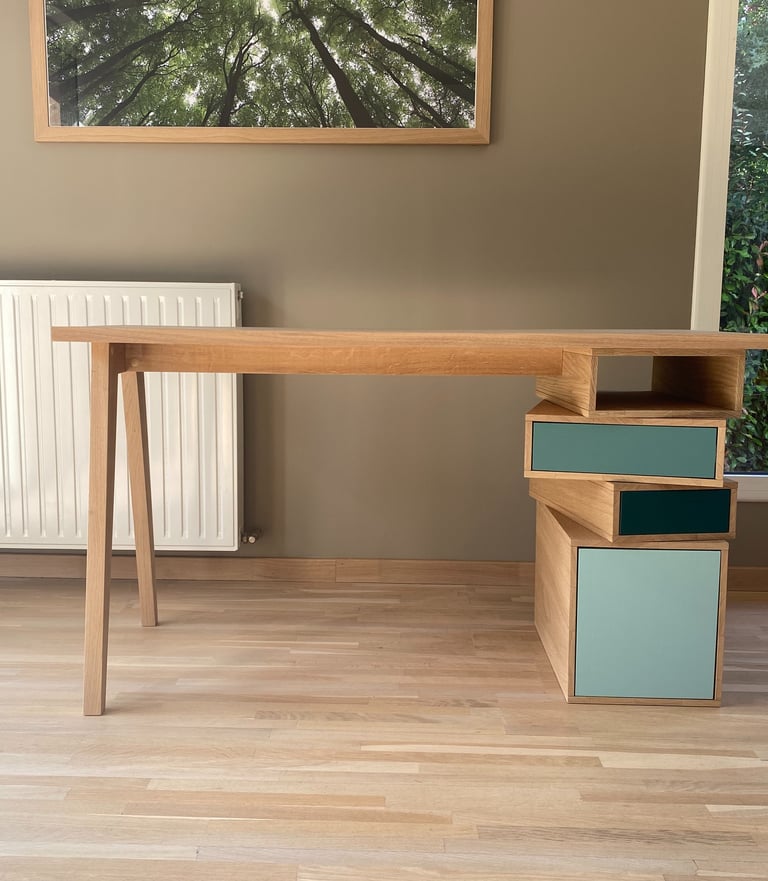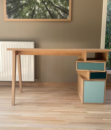 Rebecca souhaitait un bureau pour son cabinet d'ostéopathie. Le design est très proche d'une pièce d'un célèbre éditeur de mobilier français.