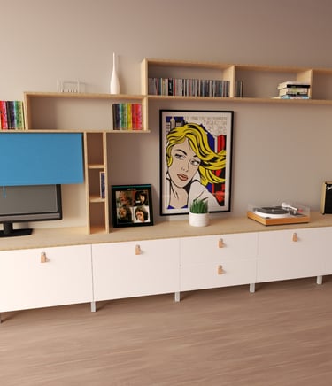 Rémy a besoin d'habiller le long mur de son salon en créant des rangements et en dissimulant l'écran de télévision.